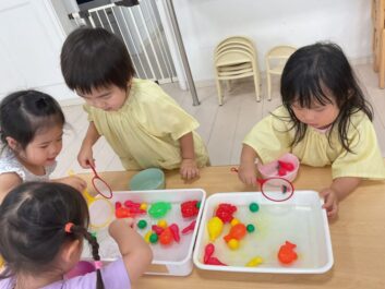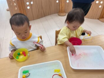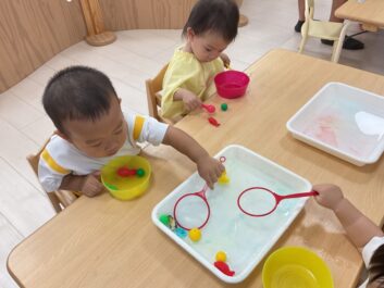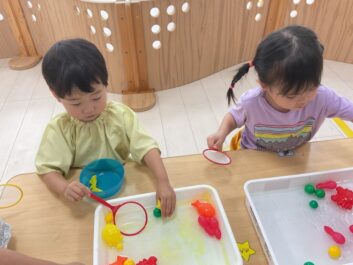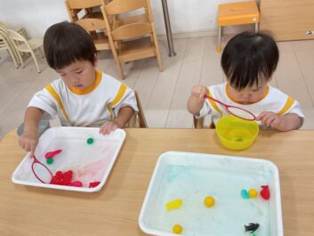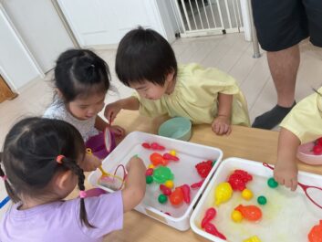 今日はいろんな海の生き物をすくって自分のお皿に入れる遊びをしました。「Shark」や「penguin」など言えるようになってきています。